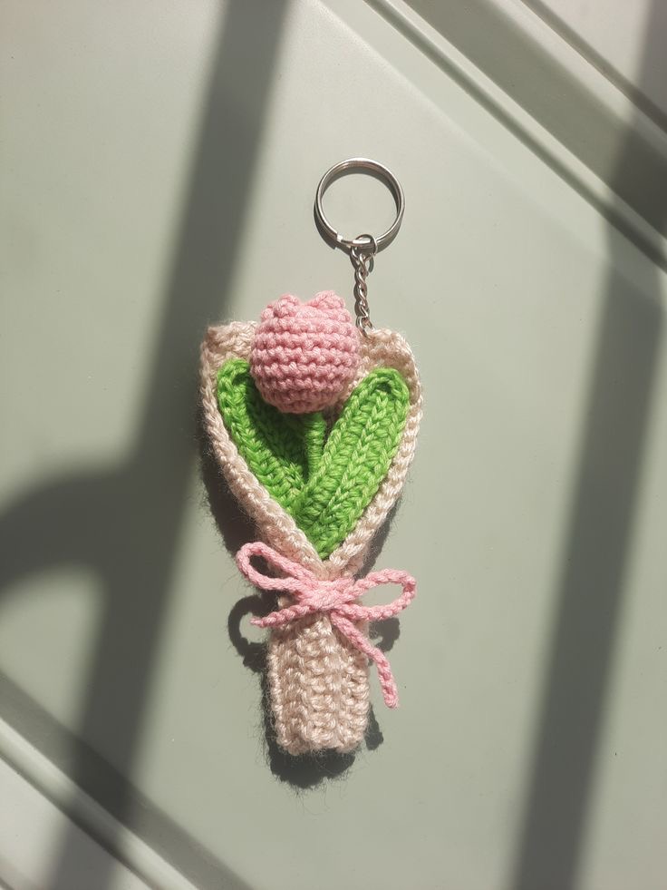 • Hardware: Equipped with a polished silver-toned metal keyring and a short link chain securely attached to the top of the bloom.